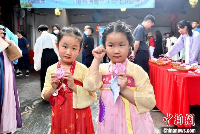 5月28日,由福建省台联、省妇联和福州市台联、市妇联主办,福州市传统文化促进会承办的“情暖聚端阳·携手向未来”——2022“六一”儿童节闽台亲子文化游园活动在福州市台湾会馆举办。21个来自闽台两地的亲子家庭着汉服齐聚一堂,通过射壶同福、包香囊、包粽子等一系列端午特色游园项目,共同感受中华民族传统文化。图为图为小朋友展示制作好的香囊。(图片来源:中新网)