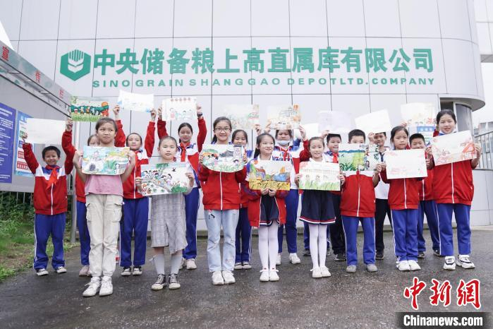 江西上高县敖阳小学十余位“小画家”走进中央储备粮上高直属库,参观“大国粮仓”,了解粮食保管储存工作,感悟爱粮节粮,现场用五彩画笔描绘出“粒粒皆辛苦”等画作。(图片来源:中新网)