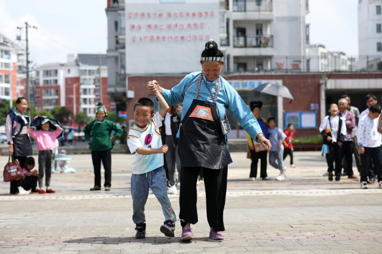 在贵州省丹寨县金泉街道移民安置社区,小朋友和家人在迎“六一”亲子趣味活动上参加游戏。(图片来源:新华社)