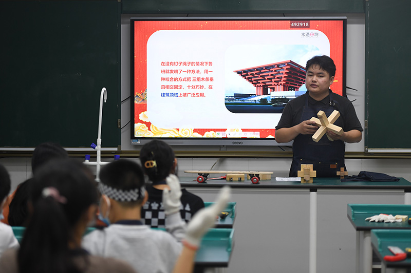 5月27日,长沙市东郡第二小学教师在木艺课上给学生介绍榫卯结构。
