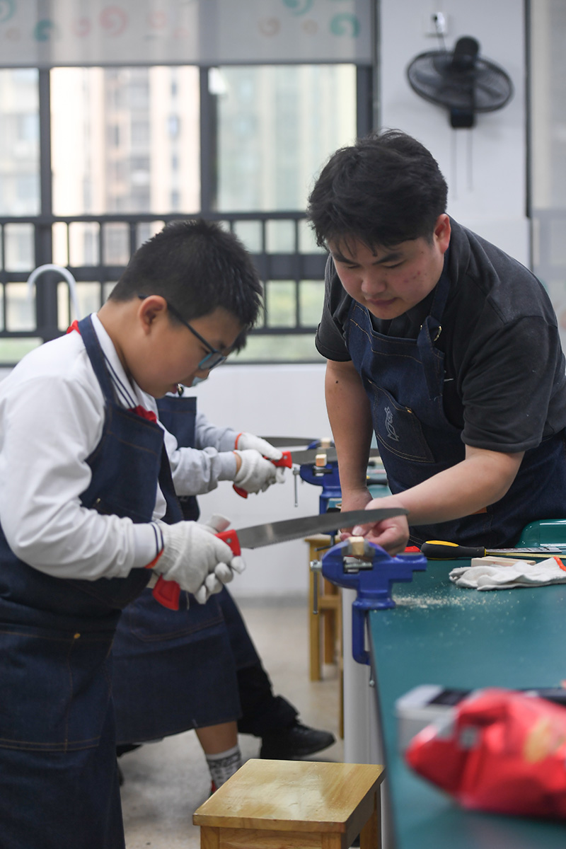 5月27日,长沙市东郡第二小学教师在木艺课上指导学生使用锯子。