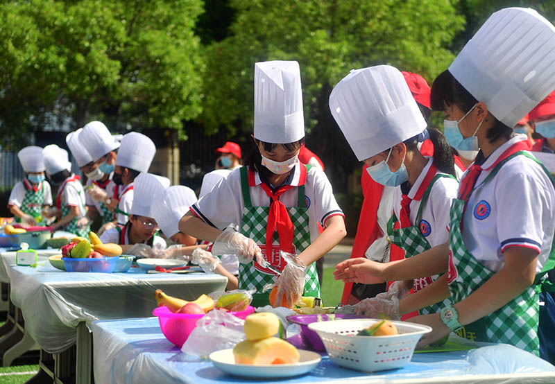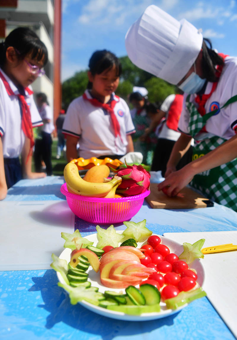 5月30日,学生在水果拼盘制作项目比赛中。当日,福建省三明市沙县区城关第三小学举行“别样过六一”劳动技能大比拼活动,学生们通过厨艺展示、水果拼盘制作、洗晾衣物、打扫卫生等形式比拼劳动技能,从而培养学生的动手能力,提高生活自理能力。(图片来源:中新社)