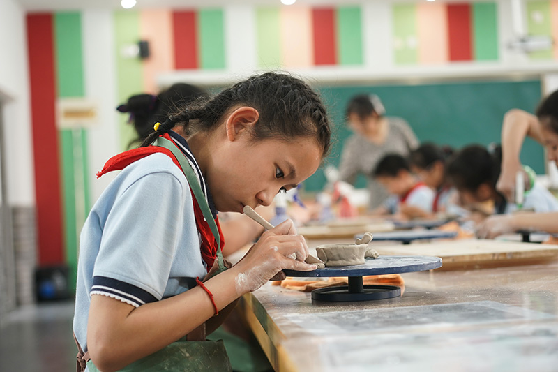 5月19日,南京市晓庄小学学生在课堂上制作泥塑。