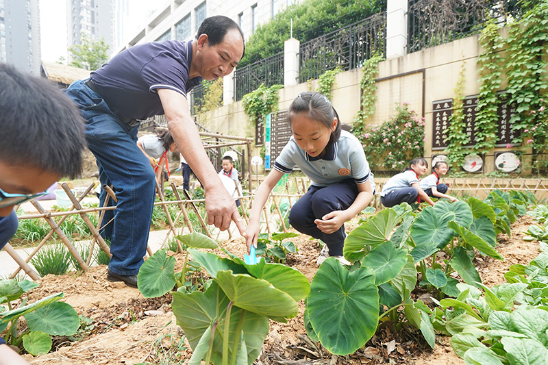 5月19日,南京市晓庄小学学生在农场辅导员的指导下给农作物培土。