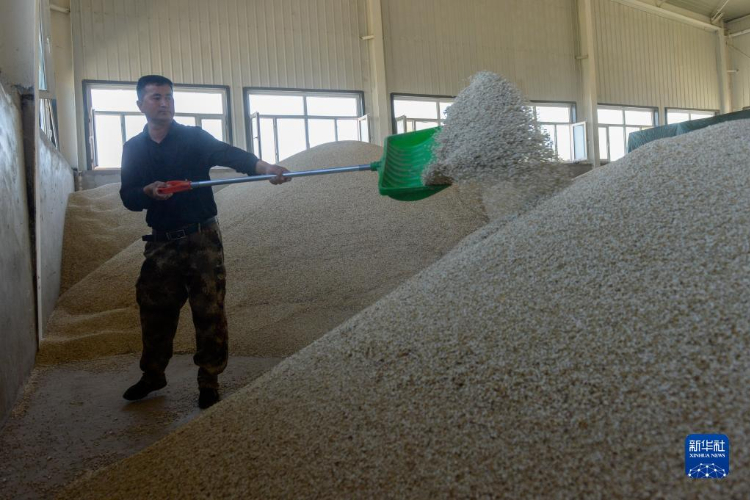 这家位于西北边陲的企业经过努力,不仅研发成功独特的红花籽油冷榨冷炼工艺,生产出可以“直接喝”的红花籽油,还带动周边红花种植户增收。一朵朵红花,正变成裕民的“金”花。图为新疆塔城地区裕民县一家红花籽油生产企业的员工在翻晾红花籽。