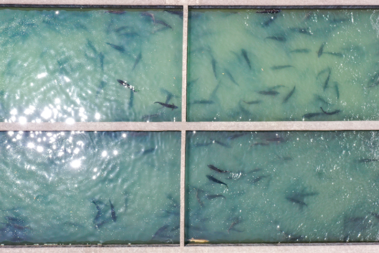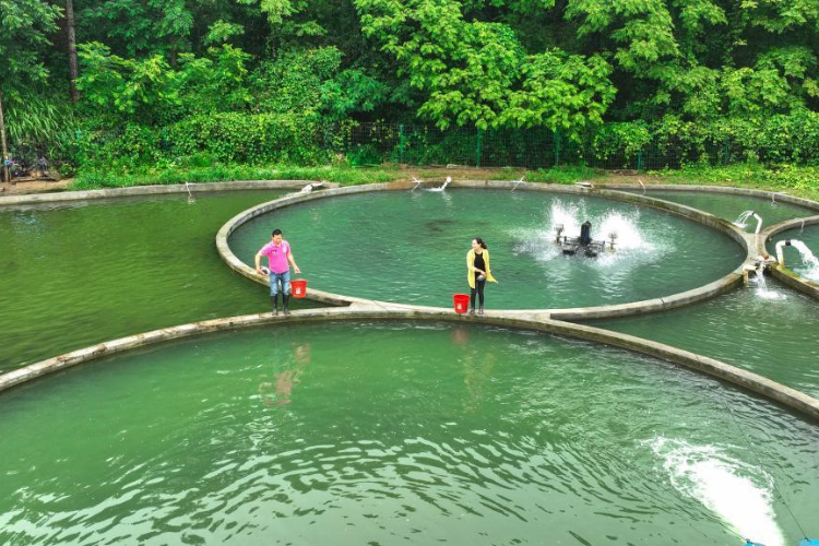 近年来,湖南省常宁市胜桥镇龙堰村充分利用当地优质水资源,采取“村党支部+公司+合作社+农户”模式,因地制宜发展特色鲟鱼养殖产业,建设集繁育、养殖、科研为一体的鲟鱼养殖综合产业体系,促进村集体经济发展,助力农民增收。图为在常宁市胜桥镇龙堰村鲟鱼养殖基地,工作人员在给鲟鱼投喂饲料。