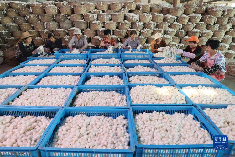 时下正是春茧收购时节,浙江省湖州市德清县新安镇的蚕农纷纷抓紧摘茧和售茧,各蚕茧收购点陆续开秤收购春茧。德清县作为杭嘉湖地区蚕桑的主要产地之一,有着悠久的蚕桑生产历史。图为5月27日,浙江省湖州市德清县新安镇一家蚕茧收购点的工人在筛选优质蚕茧。