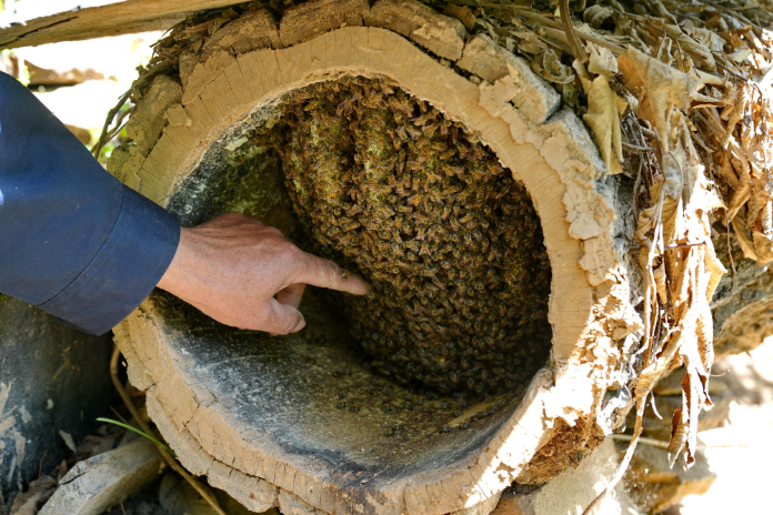 近年来,河北省赞皇县充分发挥山场面积大、蜜源丰富的优势,引导农民利用空心树段等材料作蜂窝饲养土蜂,并采用传统技法酿造蜂蜜,使古老的树洞养蜂技法得到传承。据介绍,目前该县养殖土蜂达5万群,带动1260户山区农民增收。图为在赞皇县嶂石岩镇下大凡村,蜂农查看树洞蜂巢内幼蜂的情况。(图片来源:新华网)