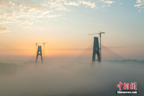江面薄雾笼罩下的宜宾临港公铁两用长江大桥。(图片来源:中新网)