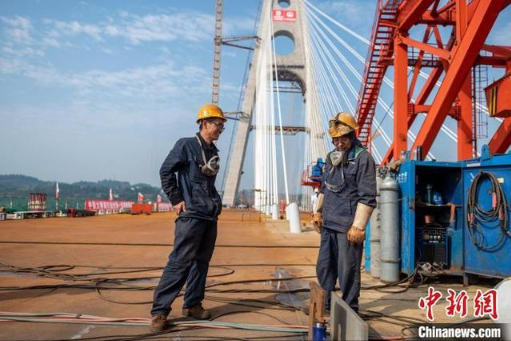 合龙现场两名工人师傅正在商讨焊接作业。(图片来源:中新网)