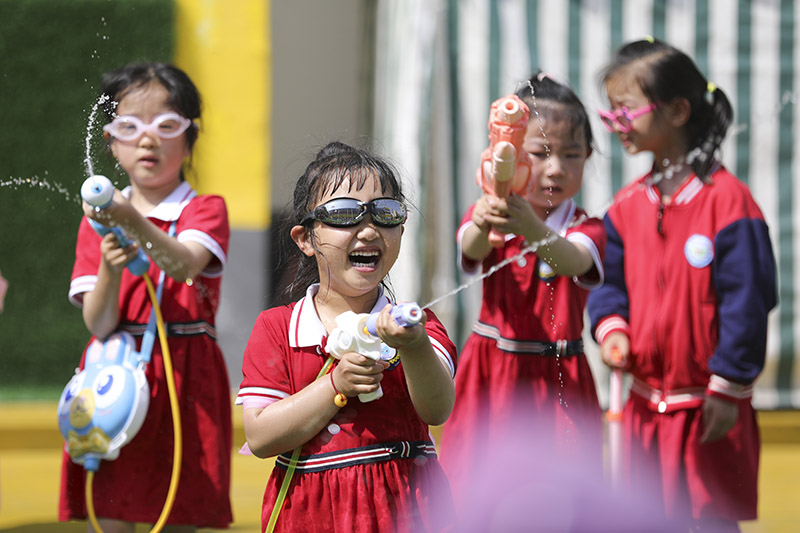 5月30日,在江苏省淮安市洪泽湖幼儿园迎“六一”活动中,小朋友们在“打水仗”。(图片来源:本文图片除标注外均自新华社)