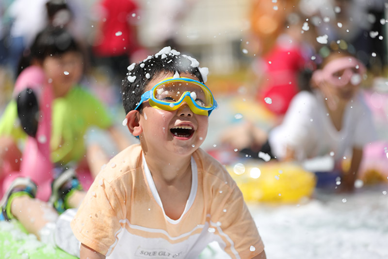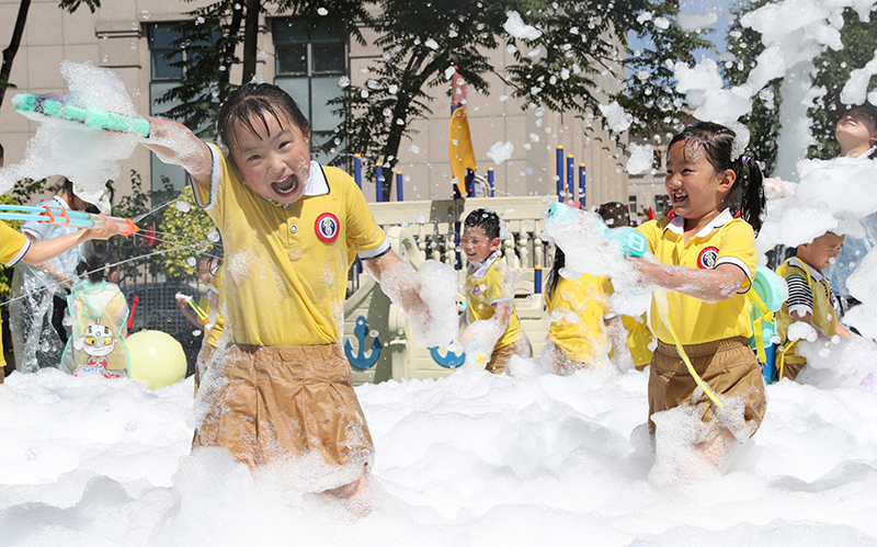 5月30日,“六一”国际儿童节来临之际,为了让孩子们尽情感受童年的精彩纷呈,宁夏回族自治区人民政府机关幼儿园精心准备“泡泡大战”游戏活动,让小朋友们体验玩水的乐趣。(图片来源:中新社)