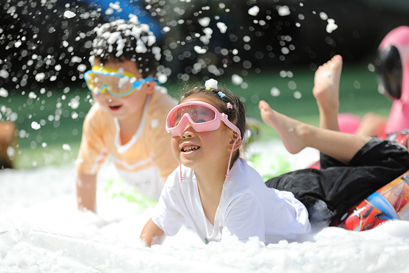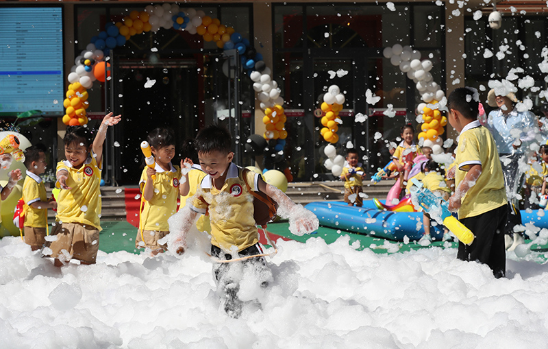 5月30日,在江苏省淮安市洪泽湖幼儿园迎“六一”活动中,小朋友们在参加“泡沫派对”活动。