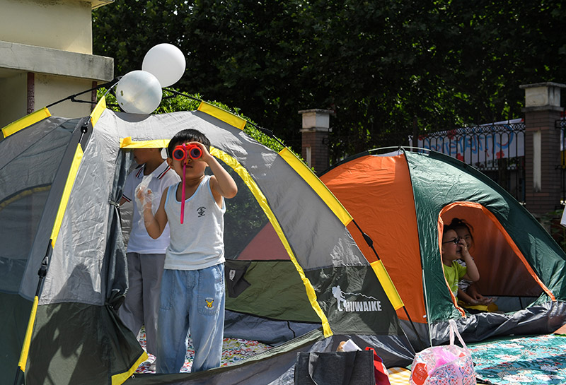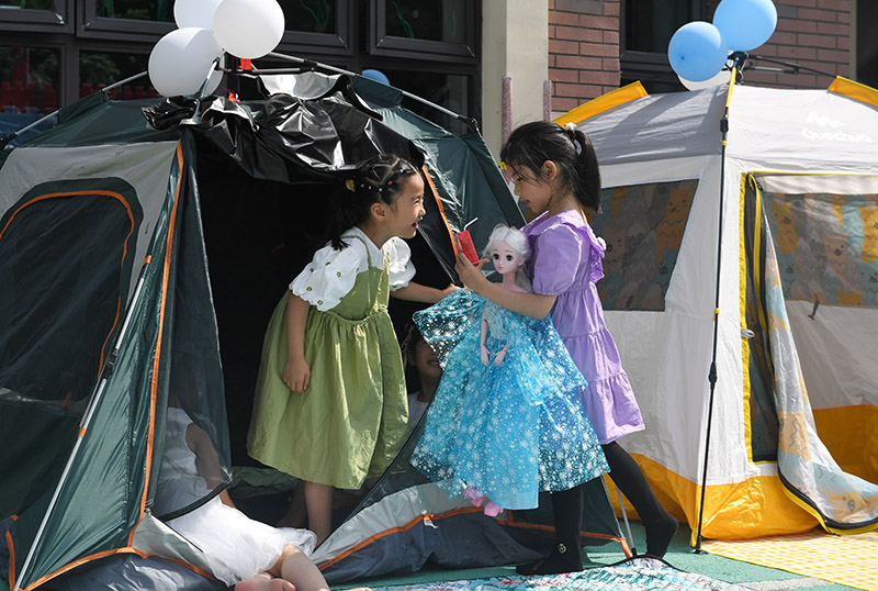 5月31日,安徽合肥,小朋友在帐篷旁玩耍。当日,安徽省合肥市常青街道姚公社区妇联在辖区幸福天使幼儿园开展“六一帐篷节”活动,让孩子们在玩耍中感受童年快乐时光。(图片来源:中新社)