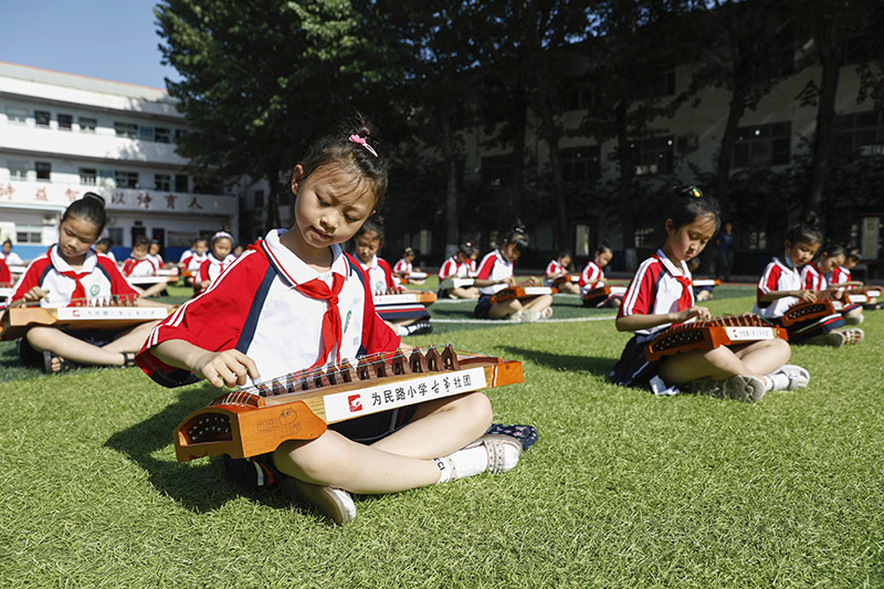 5月30日,河南省平顶山市宝丰县为民路小学学生在表演古筝弹奏。