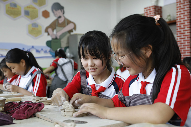 5月30日,河南省平顶山市宝丰县香山路小学学生在制作泥塑。