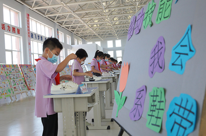 5月30日,河北省内丘县大良村小学学生在参加系鞋带比赛。