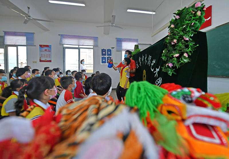 5月30日,在福建省泉州市泉港区山腰街道鸢峰小学,当地木偶艺人在给孩子们讲解、演示掌中木偶表演技巧。