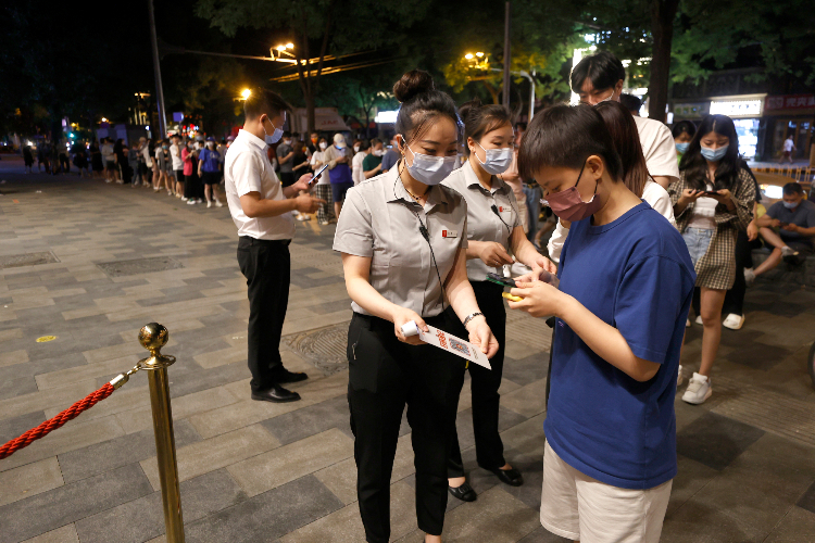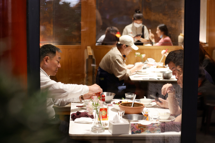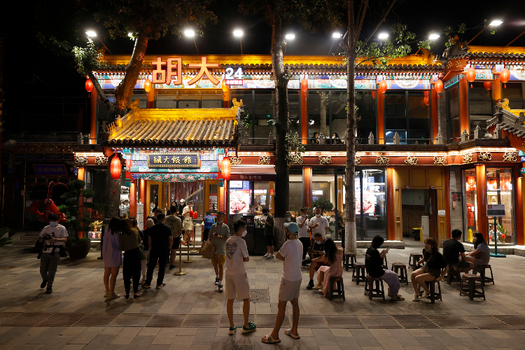 6月6日零时,食客在北京东直门内大街一餐厅外排队等待用餐。自6月6日起,北京市除丰台区全域及昌平区部分区域外,其他地区餐饮经营单位开放堂食服务。(图片来源:本文图片除标注外均综编自中新社)
