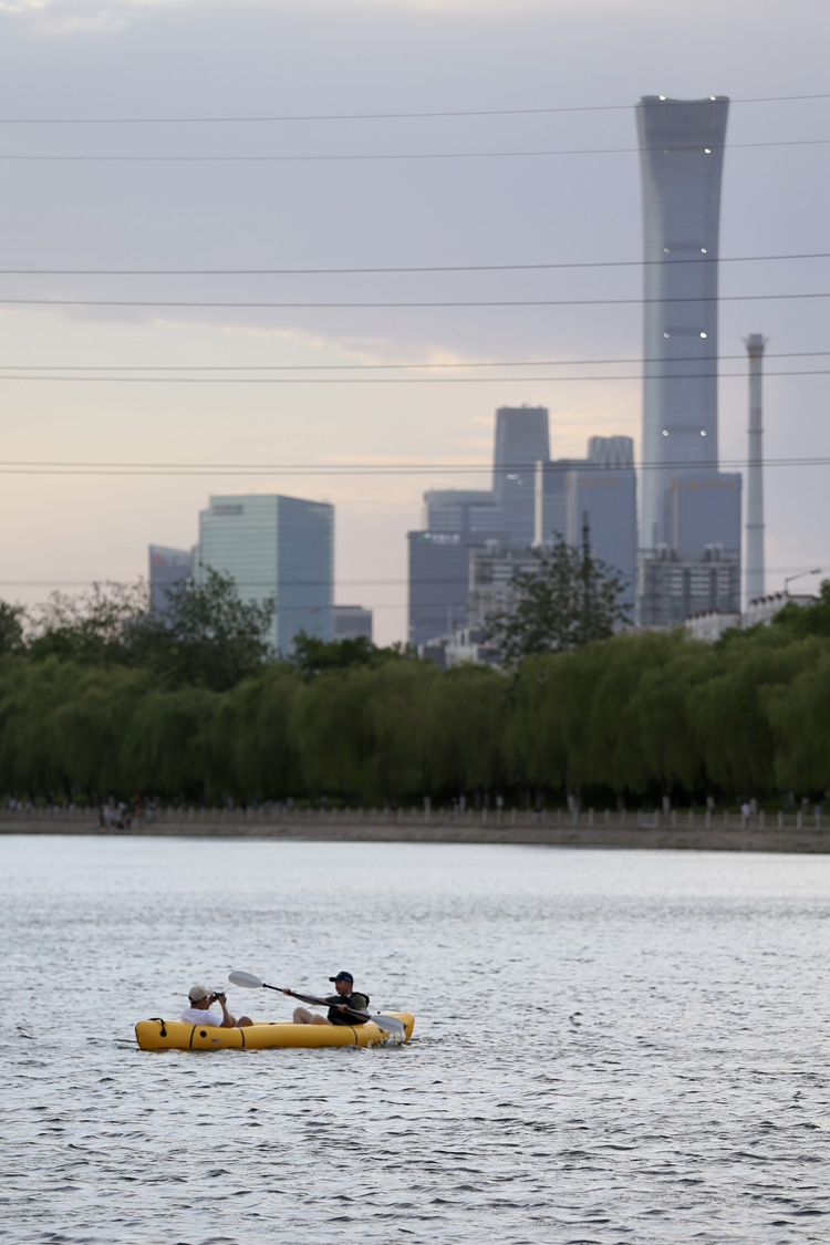 6月5日,市民在北京通惠河河道中划船享端午假期。