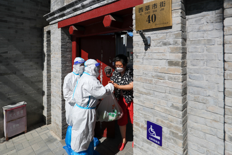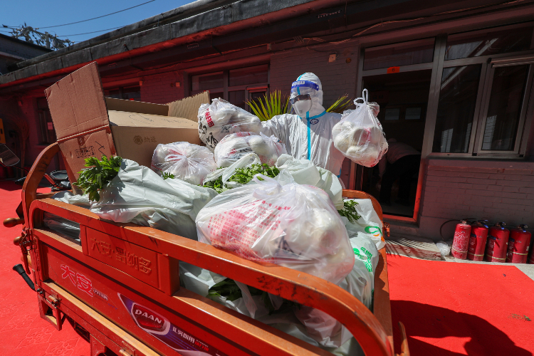 端午假期第三天,北京市天坛街道和精忠社区的工作人员为西草市东街等封管控区居民配送生活物资。自5月26日西草市东街多个院落被划为封控管控区后,街道和社区工作人员24小时在一线值守,确保居民生活物资供应和就医买药等需求。图为6月5日,工作人员将蔬菜和主食装到三轮车上准备配送。