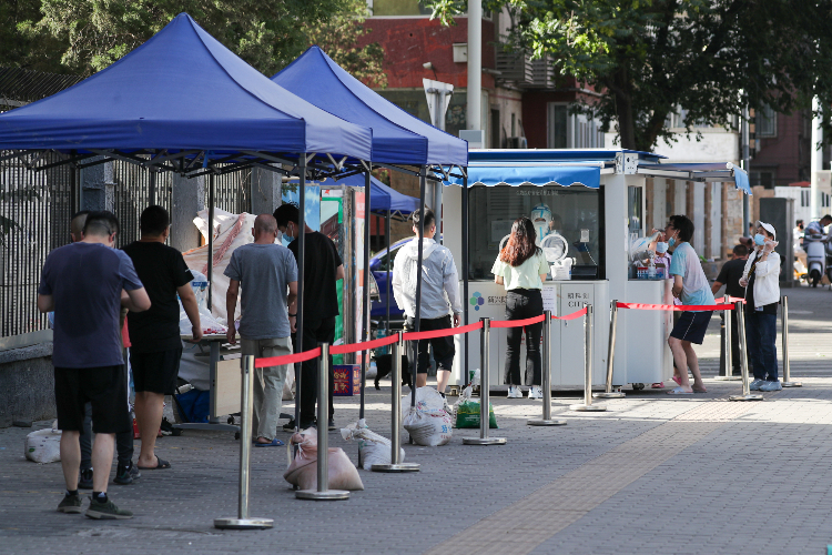 6月5日,市民在北京一处核酸检测点排队进行核酸检测。