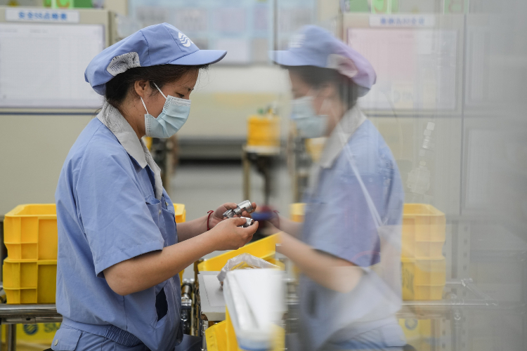 6月3日,北京疫情防控新闻发布会通报,北京疫情总体持续稳定向好,新增感染者数量持续下降,多家企业一线恢复生产。图为6月4日,在位于北京经开区的SMC(中国)有限公司厂房内,工人正在工作。(图片来源:新华社)