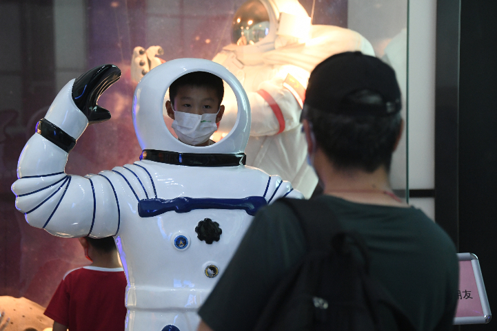 进入6月,北京市在继续分区分级做好社会面防控工作的前提下,连续7日无新增社会面病例的区,图书馆、博物馆、影剧院、美术馆、文化馆和体育健身等非地下空间场所按照50%限流开放。图为6月1日,一名小朋友在中国电影博物馆拍照留念。(图片来源:新华社)
