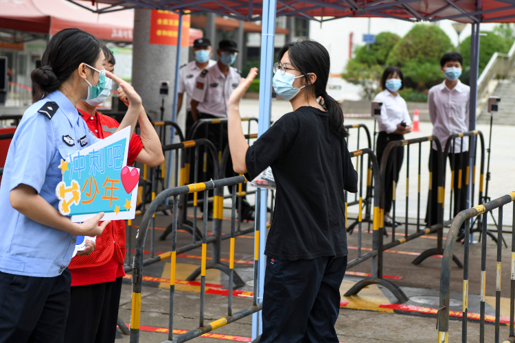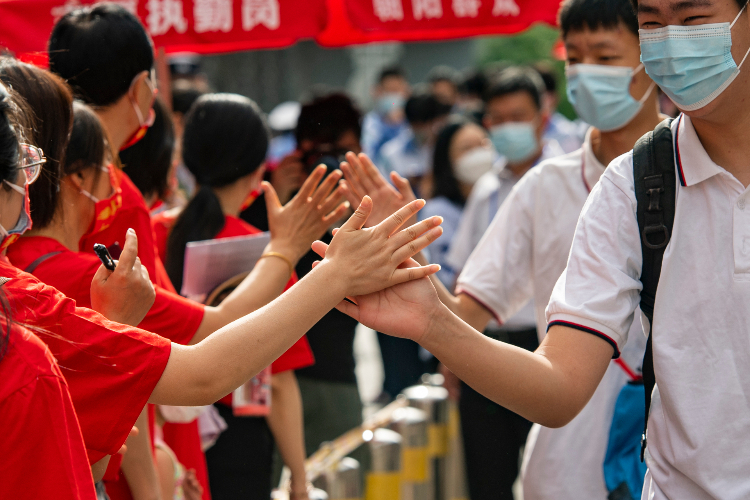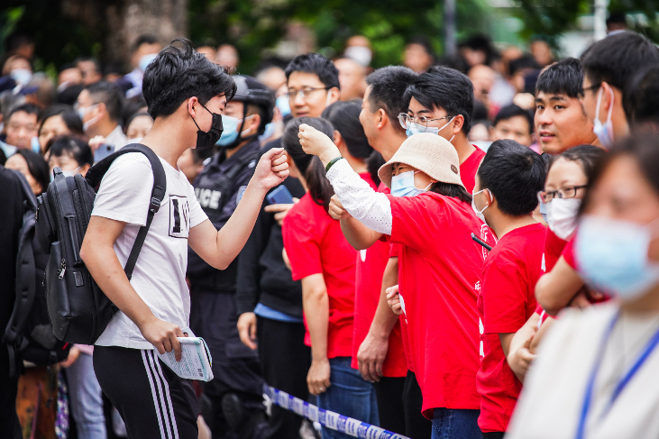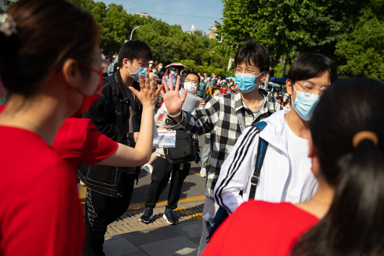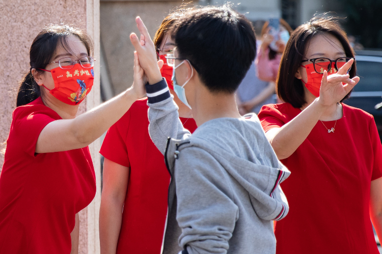 江苏省南京市雨花台中学高考考点,参加高考的学生入场前与送考老师击掌。