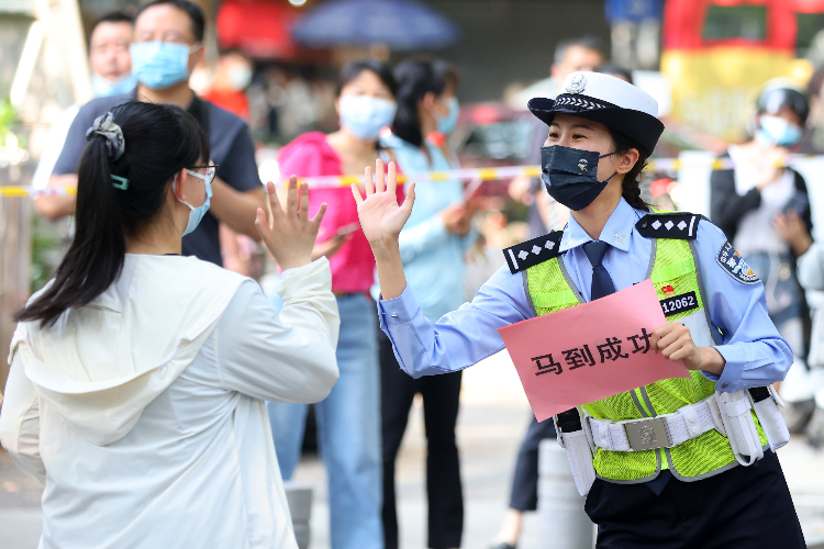 江苏省南京市一高考考点,一名交警与考生击掌送祝福。