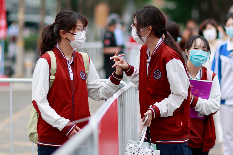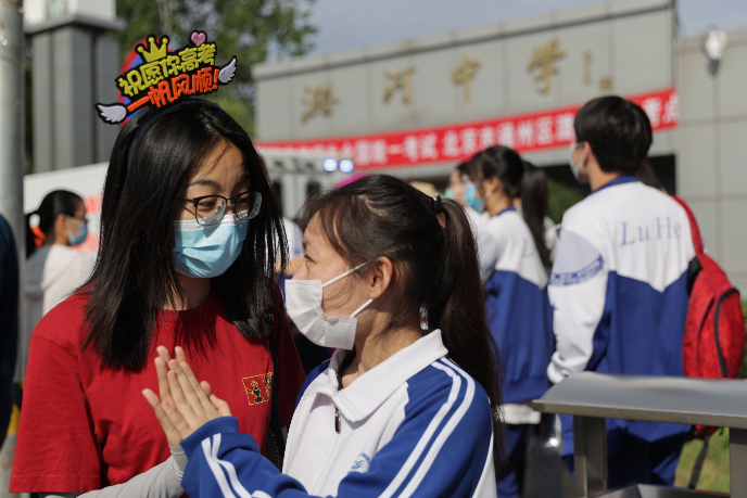 北京实验学校(海淀)考点,考生在进入考场前相互鼓励。