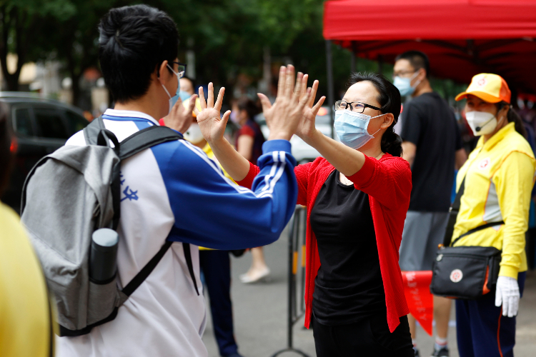 6月7日上午,北京市朝阳区陈经纶中学考点外,参加高考的学生入场前与送考老师击掌。(图片来源:本文图片除标注外均综编自中新社)