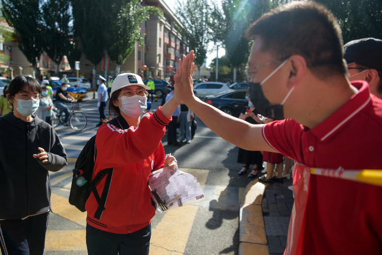 在北京市陈经纶中学考点外,考生在进入考点时与送考老师击掌。(图片来源:新华社)