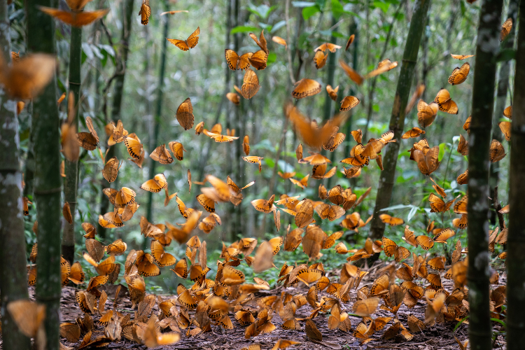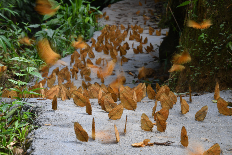 1.5亿只箭环蝶在树林间、小路上大量聚集飞舞,形成美丽的蝴蝶奇观。(图片来源:中新社)