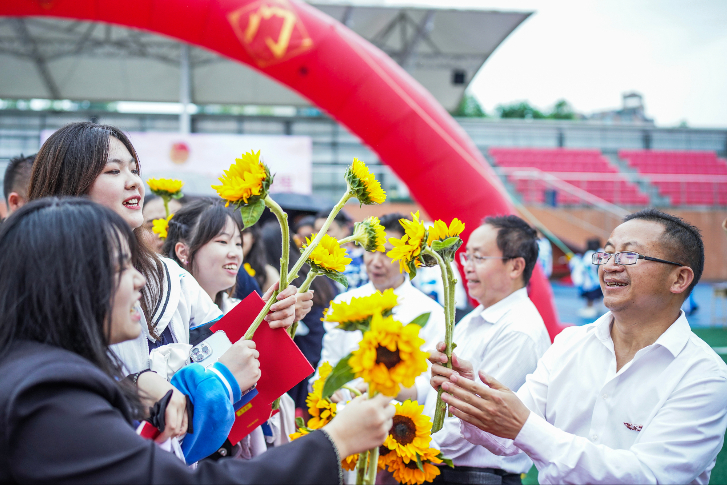 贵阳市乌当中学高三学生接过老师赠送的向日葵。(图片来源:新华社)