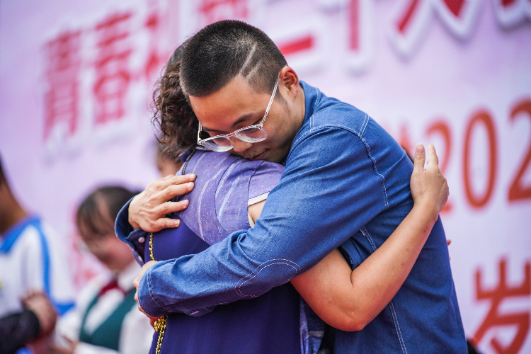 贵阳市乌当中学高三学生在毕业典礼上拥抱母亲。(图片来源:新华社)
