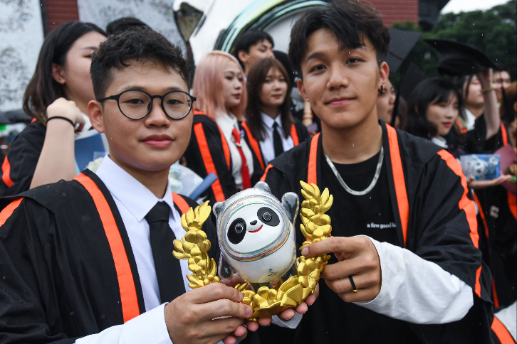 8日,广州美术学院举行毕业典礼,近1700名毕业生每人都收到了学校赠送的冰墩墩,在离校前圆了“人手一墩”的梦想。图为广州美院毕业生捧着冰墩墩在校园内拍照留念。(图片来源:新华社)