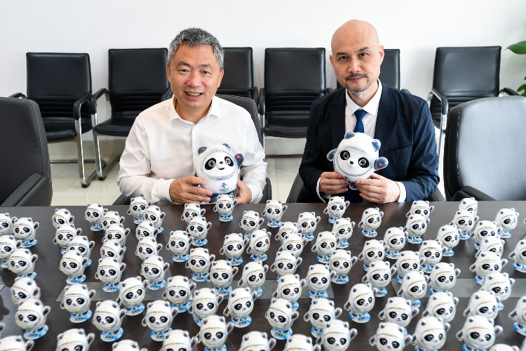 广州美院党委书记谢昌晶(左)和冰墩墩设计总执行刘平云给毕业生的冰墩墩签名。(图片来源:新华社)