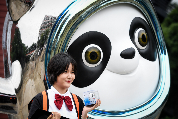 一名广州美院毕业生捧着冰墩墩在校园内拍照留念。(图片来源:新华社)