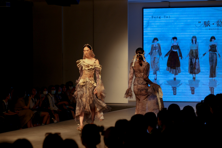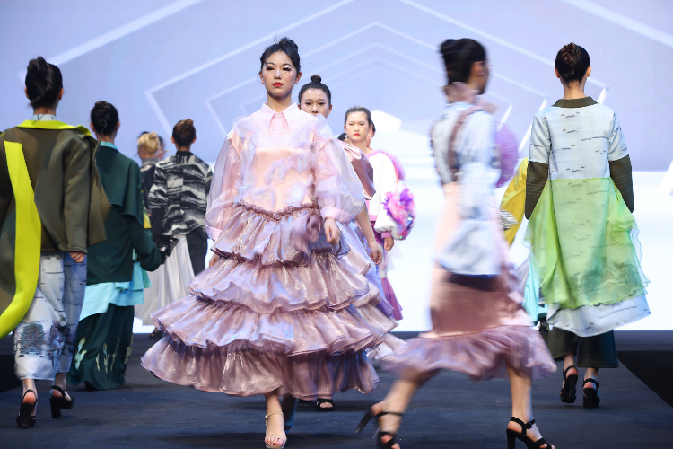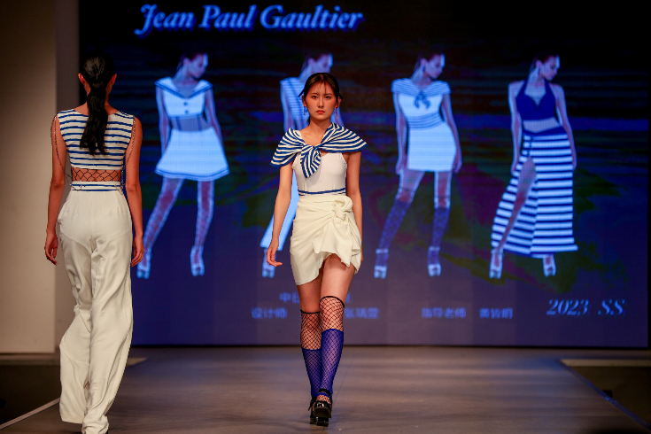 今年该校时装周将持续4天,共安排5场优秀作品发布会,其中包含中英项目成衣展、服装设计成衣展、2022届毕业生优秀毕业设计作品展等。图为模特展示毕业生服装设计作品。(图片来源:中新社)