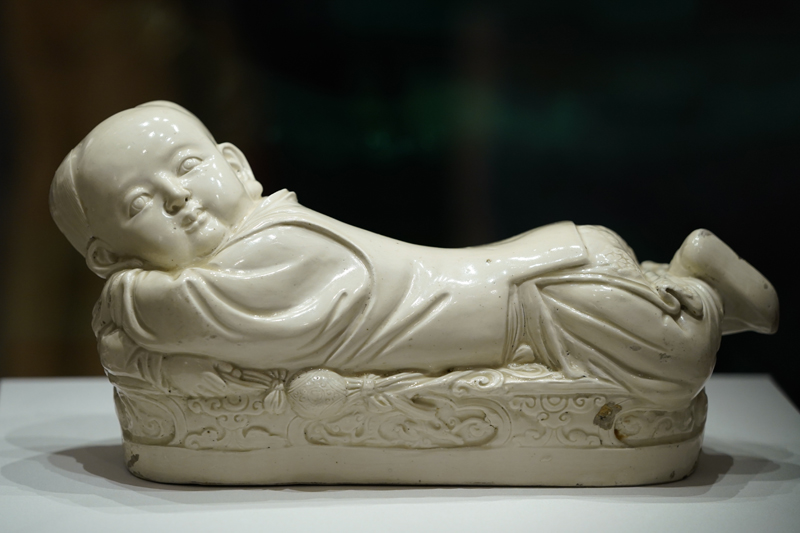 国家一级文物北宋定窑白釉孩儿枕。(图片来源:中新社)