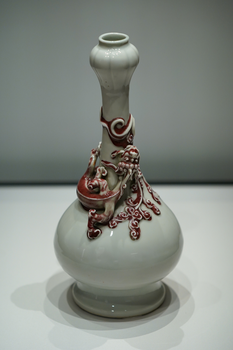 国家一级文物明白釉塑贴鲜红蟠螭蒜头瓶。(图片来源:中新社)