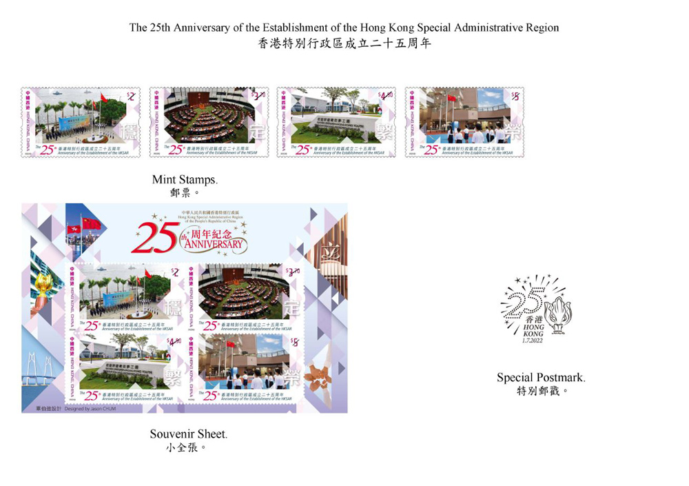 中新社报道,2022年是香港特别行政区成立25周年,香港邮政发行一套四枚纪念邮票、一张小全张和相关集邮品,以资纪念。邮票展示在实施香港国安法及完善选举制度后的香港,回到“一国两制”的正确轨道,以维持长期繁荣稳定。同时,邮票带出教育学生国民身分认同,以及在“十四五”规划和粤港澳大湾区建设带动下,香港将更积极融入国家发展大局,在未来数十年为年轻人和企业带来庞大的发展机遇。