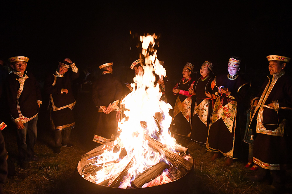 西藏林芝市扎西岗村民众燃起篝火。(图片来源:中新社)
