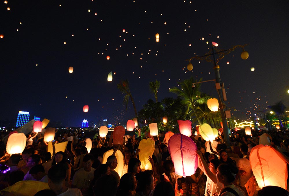 云南西双版纳:万人齐放孔明灯。(图片来源:中新社)