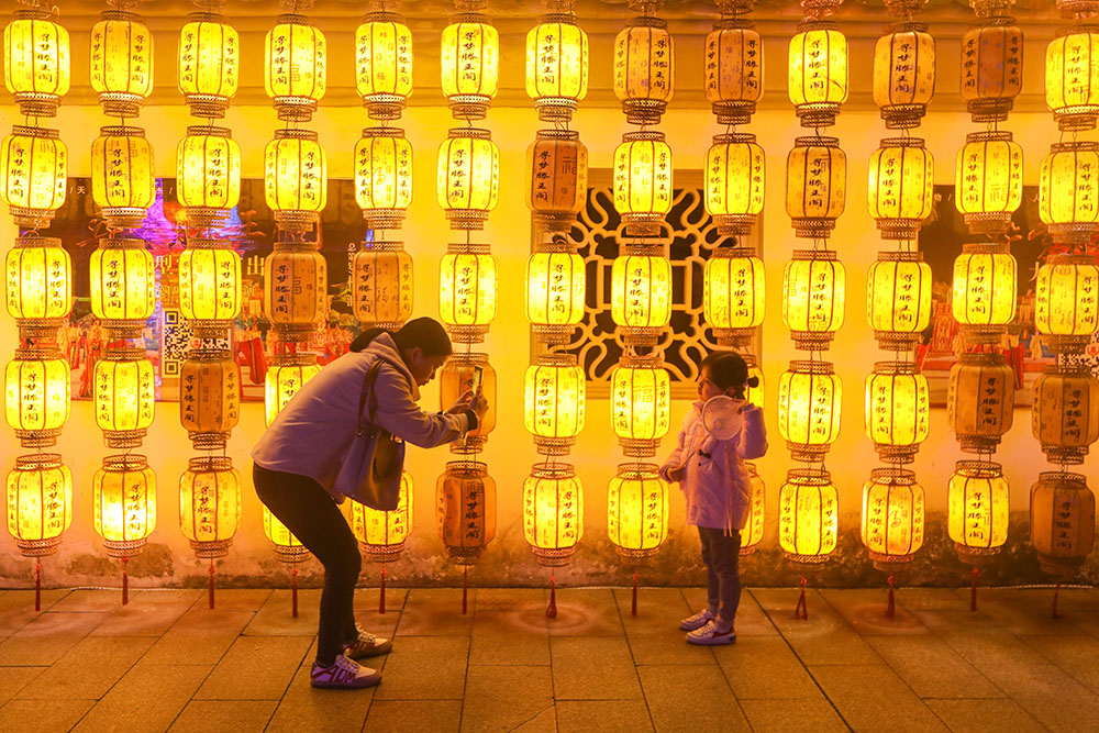 江西南昌,市民在灯笼墙前拍照。(图片来源:中新社)