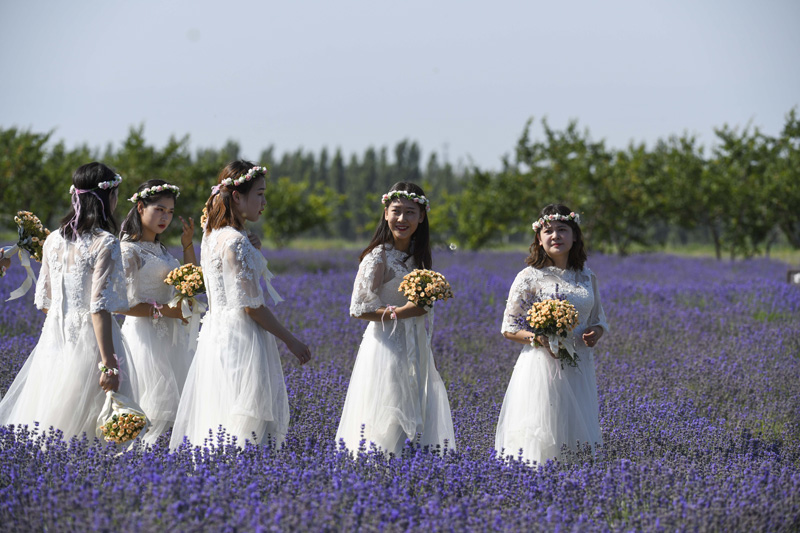 6月22日,当地评选的薰衣草形象大使行走在新疆霍城县四宫村薰衣草花田里。(图片来源:新华社)