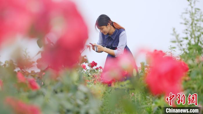 6月22日,河北省衡水市武邑县刘家村的月季花繁育基地内,游客在赏花拍照。 (图片来源:中新网)