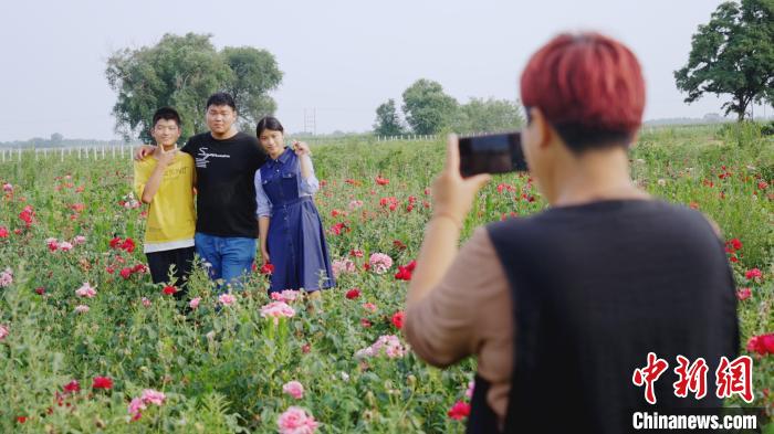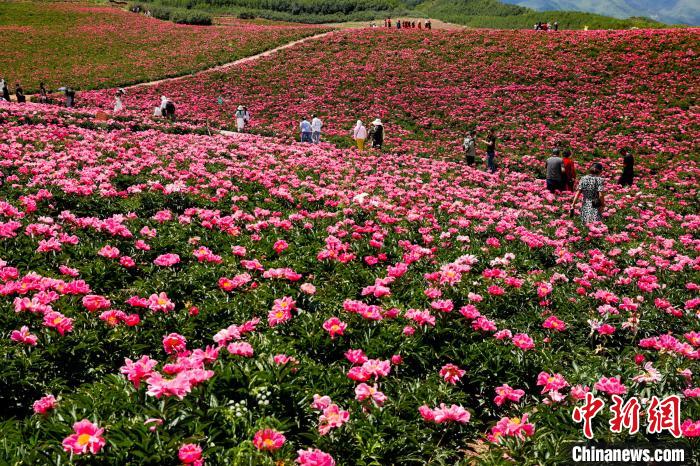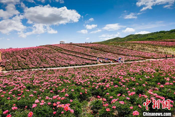 甘肃省武威市古浪县古丰镇十里花海基地内,芍药花开吸引游客。(图片来源:中新网)