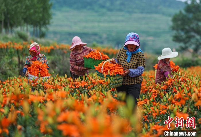 6月21日,在山东省荣成市虎山镇东庄村一处百合花种植园,花农们抓紧采摘百合花。(图片来源:中新网)